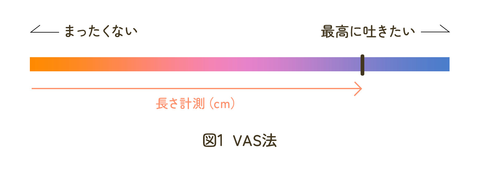 当院に通院する妊婦20名に、ビタミンB6と葉酸を含むサプリメントを朝、昼、晩の1日3回、5日間摂取してもらいました。海外での先行研究を参考に、1日当たりのビタミンB6の摂取量は25mg(ピリドキシン塩酸塩として30㎎)、葉酸は400μgとしました。サプリメント摂取前日から摂取完了後4日目まで、吐き気、食欲、嘔吐回数、食事回数などを記録していただきました。吐き気と食欲はVAS(Visual analogue scale)法で評価しました。吐き気の場合、10cmの直線の左端を「吐き気は全くない」、右端を「最高に吐きたい」として、吐き気の位置をマークしてもらう方法です。左端からの距離を測定することで、吐き気の強さを評価することができます。