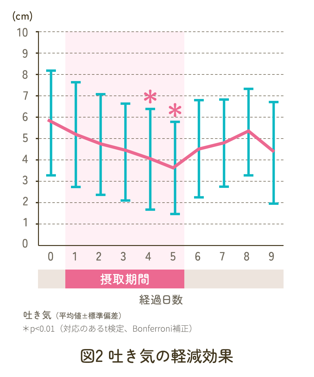 5日間のサプリメント摂取の結果、吐き気は20名中14名(70%)で改善し、摂取4日目、5日目には統計的に有意な改善が認められました(図2)。その他の指標では、食欲は11名(55%)で改善し、嘔吐症状があった8名のうち5名(63%)で嘔吐回数の減少が認められ(表)、QOLの向上が示唆されました。
