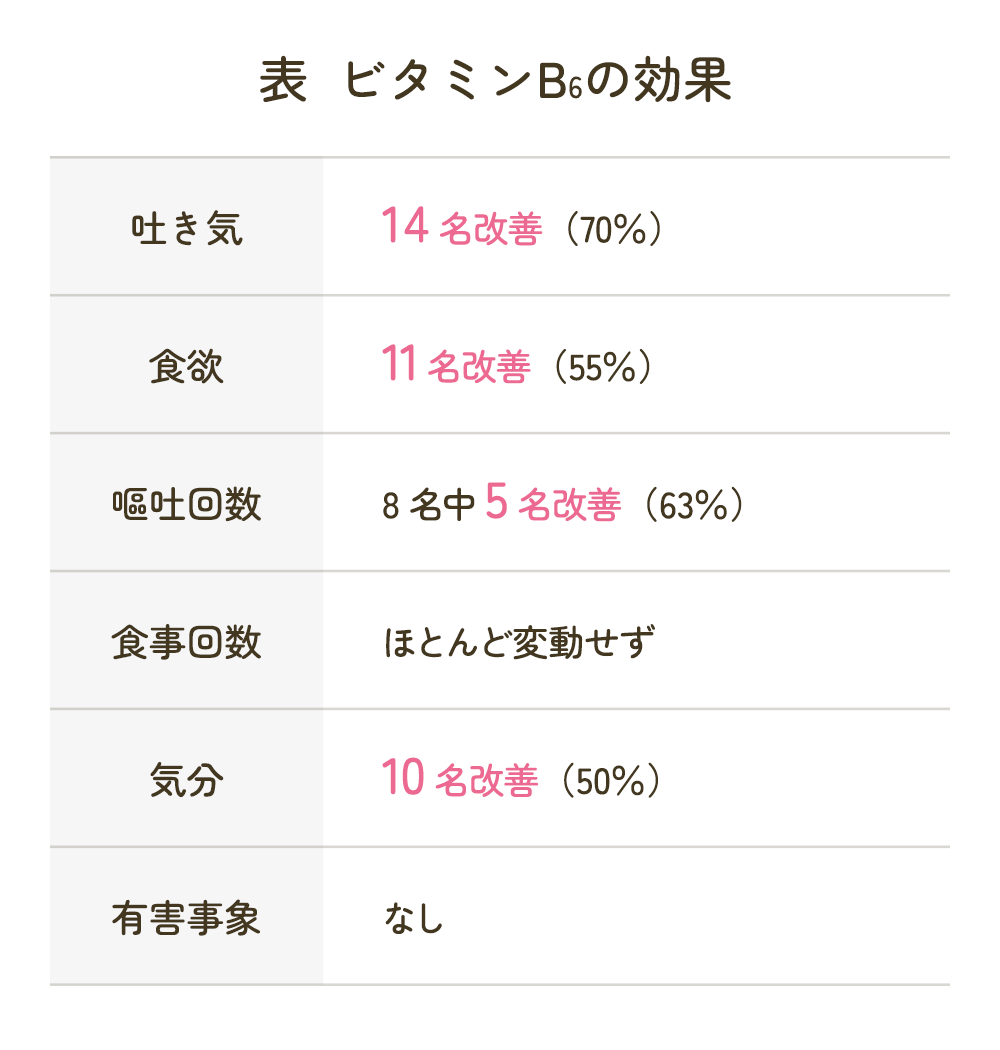 なお吐き気が改善した14名のうち12名が、ビタミンB6の摂取をやめた後に吐き気が悪化していました。つわり症状があるうちは、ビタミンB6の摂取を続けるのがよいと思われます。