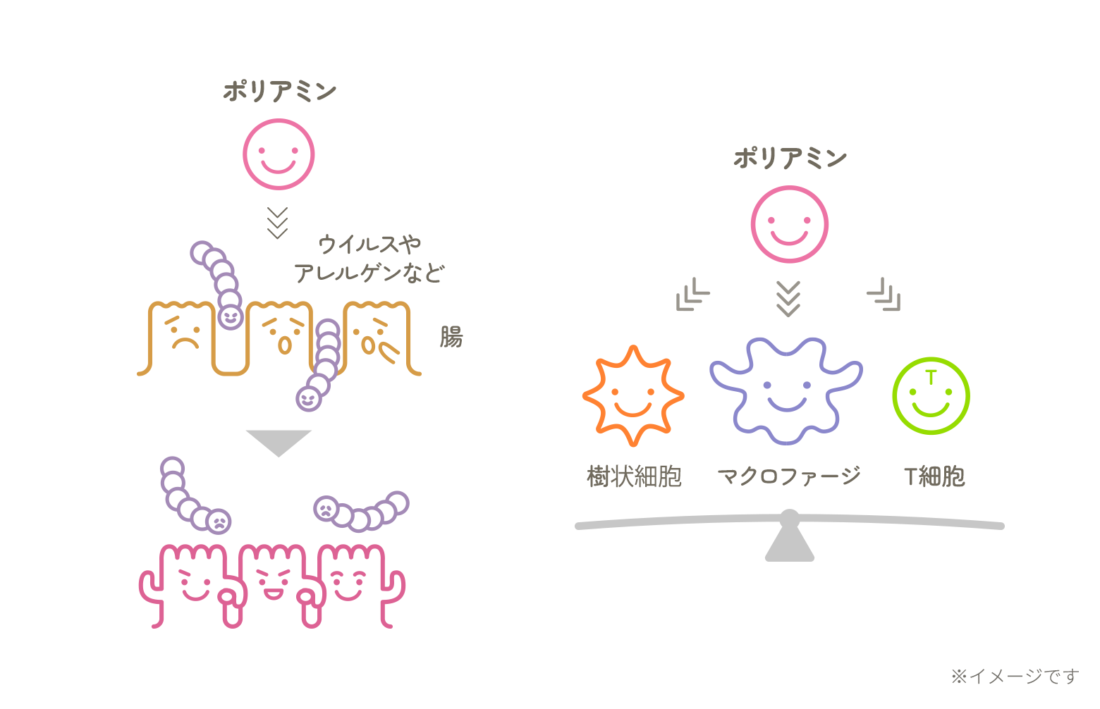 ポリアミンは腸管細胞に働きかけて増殖と分化を促します。その結果、たんぱく質などの消化が促進されるほか、細胞同士をつなぐ構造が発達して結びつきが強くなり、異物が体内に侵入しにくい、丈夫な腸へと成熟していきます[1-2]。
