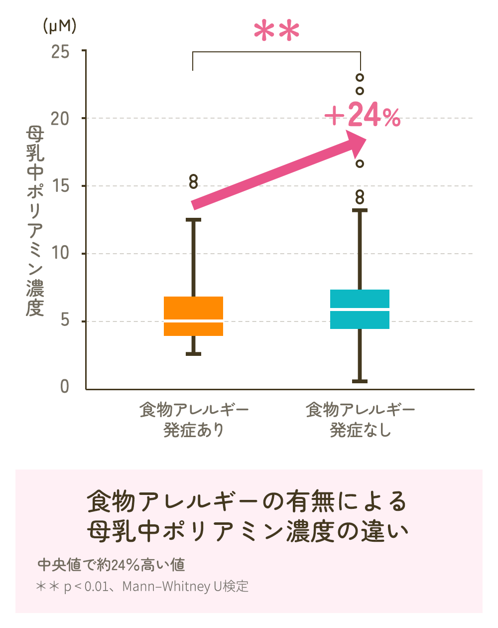左の図は、赤ちゃんが食物アレルギーを発症したグループと、発症しなかったグループに分けて、母乳中のポリアミン濃度を比較したものです。その結果、食物アレルギーを発症しなかったグループの母乳のポリアミン濃度が、食物アレルギーを発症したグループの母乳より、統計的に有意に高いことがわかりました[4]。