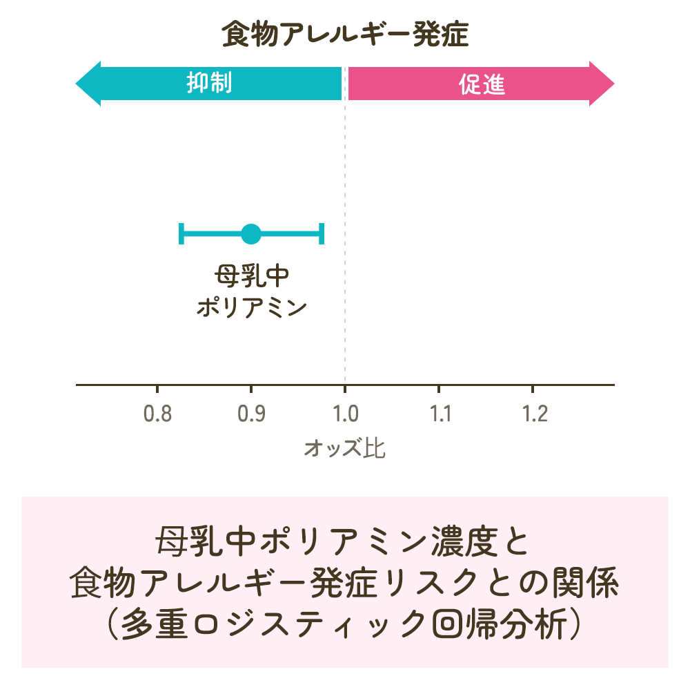 こちらの図は、母乳中のポリアミン濃度と食物アレルギー発症リスクとの関係を、オッズ比という指標で評価したものです。